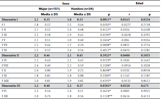 La comparación de los factores y dimensiones de las estrategias de aprendizaje según sexo y edad se presentan en la Tabla 5. Se observa que las puntuaciones promedio del Factor I: Selección y organización, son diferentes entre mujeres y hombres, éstas son mayores en las primeras, concentrándose en la respuesta bastantes veces. La misma tendencia se observa para el Factor III: Estrategias de elaboración y VII: Subrayado. En los Factores II: Conciencia de la funcionalidad de las estrategias, V: Planificación y control de la respuesta en situación de evaluación y IX: Repetición y relectura, no se encontraron diferencias significativas, pero sus respuestas se centralizan en bastantes veces y siempre. En la Dimensión I: Estrategias cognitivas y de control del aprendizaje, se observa que en términos globales, existen diferencias significativas en las puntuaciones promedios entre mujeres y hombres, las cuales son mayores en mujeres, la tendencia de respuestas están en la categoría de bastantes veces. En la Dimensión II: Estrategias de apoyo al aprendizaje, ningún Factor presenta diferencias en sus puntuaciones promedios entre mujeres y hombres, ni en la Dimensión total, la tendencia de las respuesta es hacia bastantes veces. Similar comportamiento se observa en la Dimensión III: Hábitos de estudio, donde ninguno de sus Factores muestra una diferencia significativa en las puntuaciones entre mujeres y hombres, ni en la Dimensión total. De igual manera, la tendencia de respuesta es hacia bastantes veces. Según edad, no se aprecian relaciones significativas en ninguna de las tres dimensiones.