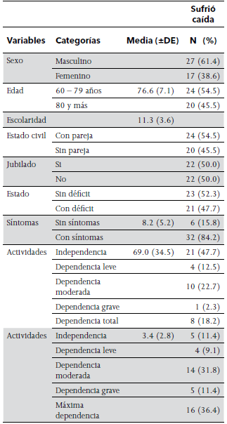 La prevalencia de caídas en la población general fue de 24% (44). En relación con la población de adultos mayores que sufrieron caídas, se verificó el predominio del sexo masculino (61.4%), de los adultos mayores con edad entre 60 a 79 años (54.5%) con media de 76.59 (±7.12) años, escolaridad media de 11.32 (±3.65) años, los que tienen pareja (54.5%), no presentar déficit cognitivo (52.3%), aquellos con síntomas depresivos (84.2%) con media de 8.20 (±5.25), independientes en las ABVD (47.7%) con media de 68.98 (±34.51) y con máxima dependencia para las AIVD (36.4%) con media de 3.36 (± 2.82) (Tabla 1).