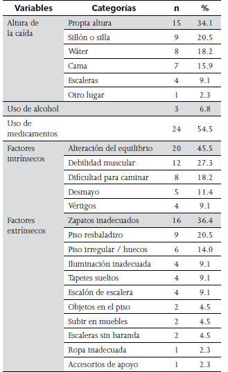 Entre las características de las caídas, el 34.1% cayó de la propia altura, 6.8% hacían uso del alcohol y 54.5% de medicamentos. Algunas de las causas intrínsecas que causaron la caída, el 45.5% presentaron alteración del equilibrio seguido del 27.3% con debilidad muscular y entre las causas extrínsecas, el 36.4% por uso de zapatos inadecuados y 20.5% por caminar en piso resbaladizo (Tabla 2).