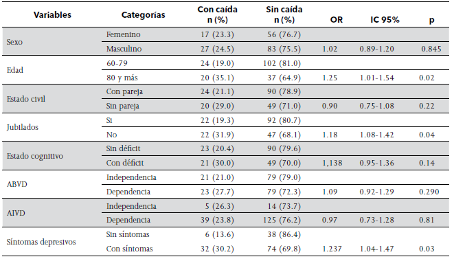 Para el cálculo del Odds Ratio con el Intervalo de Confianza (IC) del 95% fueron recategorizadas las variables de estudio de caída (sí y no), edad (60-79, 80 y más), estado civil (con y sin pareja) y jubilación (si y no). En la evaluación del adulto mayor se caracterizó el estado cognitivo (con y sin déficit), la capacidad funcional tanto para las ABVD como para las AIVD se categorizó en independencia y dependencia, y la GDS en con y sin síntomas depresivos. Todos los análisis presentaron una significancia alfa de ≤0,05.