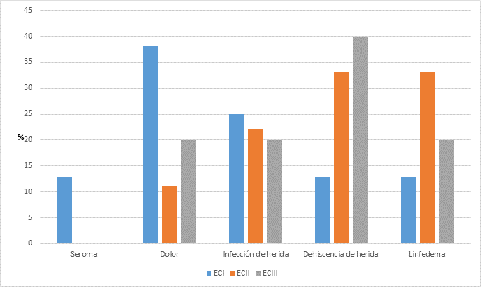 Por último, como se muestra en la Figura 1, las mujeres con ECI presentaron en mayor proporción dolor (38%), en estadio ECII se complican más por linfedema y dehiscencia de herida (33% en ambos casos) y en estadio ECIII prevalece en mayor proporción la dehiscencia de herida (40%). Además, a las mujeres que se les realizó mastectomía radical modificada, mostraron mayor proporción de complicaciones (77%) comparado con cuadrantectomía (5%) y mastectomía total (18%).
