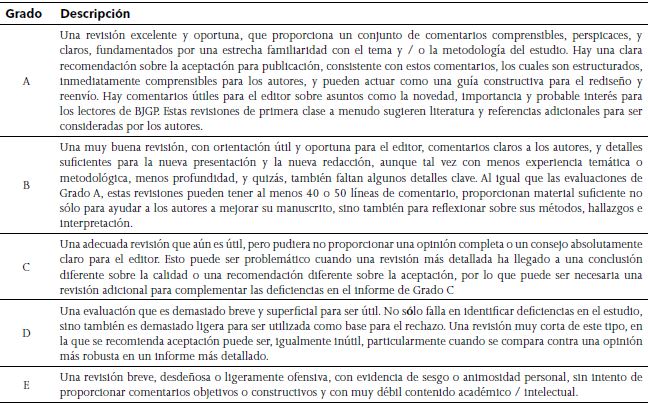 Al respecto, la revista británica de práctica general, ha estudiado la influencia de brindar esta retroalimentación para la actuación posterior del revisor, se identificó una tendencia negativa entre los revisores mal calificados, aunque no fue estadísticamente significativa; consideran que probablemente, la retroalimentación es una herramienta educativa más efectiva para quienes la buscan, activamente. En esa misma línea decidieron probar otro sistema validado para realizar la evaluación de rutina de las tareas de revisión y poder proporcionar retroalimentación; seleccionaron un sistema de puntuación, basado en los 5 puntos ideado por los editores de Obstetricia y Ginecología, lo adaptaron al Sistema A, B, C, D, E, que ellos ya tenían en marcha (un programa en línea que permite a los revisores ver su calificación promedio de revisión, obtener retroalimentación narrativa, así como recibir comentarios de acuerdo a los criterios de revisión, y se asesora en lo que sea necesario)3 . Por la importancia que puede tener su uso en nuestra revista, se reproducen esos criterios.