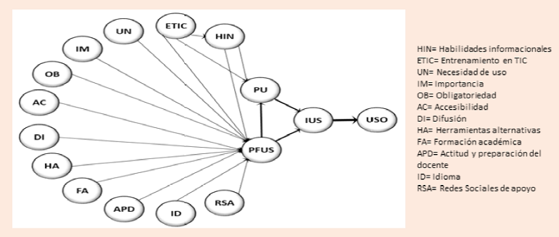 Descripción del instrumento de medición: se compone de 16 variables, cada una corresponde a 1 Item. Cuatro de ellas corresponden al Modelo TAM13 y 12 no pertenecientes al TAM, integradas a este estudio a partir de lo sugerido por la literatura. Las variables TAM están compuestas cada una por tres dimensiones. El detalle de las dimensiones de las variables integradas es: una dimensión para las siguientes variables; la importancia (IM), la actitud y preparación docente (APD), la accesibilidad (AC) y las redes sociales de apoyo virtual (RSA). Dos dimensiones para las variables necesidad de uso (UN), herramientas alternativas (HA), la obligatoriedad (OB), el Idioma (ID) y la difusión (DI). Tres dimensiones para las variables formación académica (FA); siete dimensiones para habilidades informacionales (HI) y nueve dimensiones para entrenamiento en TIC (ETIC). Las escalas de medición de todas las variables incluidas en el instrumento se midieron en escala Likert de cinco puntos, categorizado como: 1= Nunca, 2= Muy pocas veces, 3= Algunas Veces, 4= La mayoría de las veces, 5= Siempre. Este instrumento fue revisado por tres expertos y la confiabilidad del instrumento fue medida con alfa de Cronbach, se obtuvo un valor de 0.7. Para el procesamiento de datos se utilizó el programa Partial Least Square (PLS).