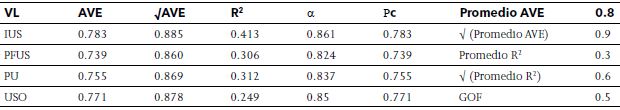 En la Tabla 1 se observan los análisis a las VL reflectivas, específicamente. El análisis a partir del coeficiente de alfa de Cronbach (α) arrojó valores (todos >0.8) y la fiabilidad compuesta del constructo (ρc), arroja valores (todos >0.7)39. El análisis de la validez convergente AVE arroja valores (todos >0.7). Las (√) de AVE, arrojan valores mayores a las correlaciones con el resto de VL. Estos resultados en su conjunto confirman consistencia interna del modelo de investigación y fiabilidad del constructo40, 41.