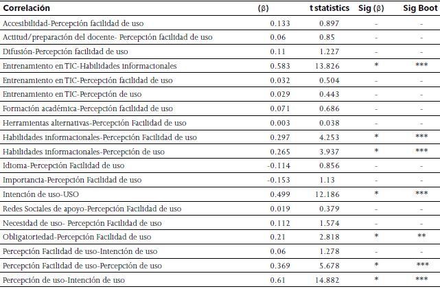 Los análisis estadísticos identificaron que el modelo estructural del estudio presenta un alto poder predictivo de la variable dependiente USO por sus variables antecedentes, así como un buen ajuste global.
