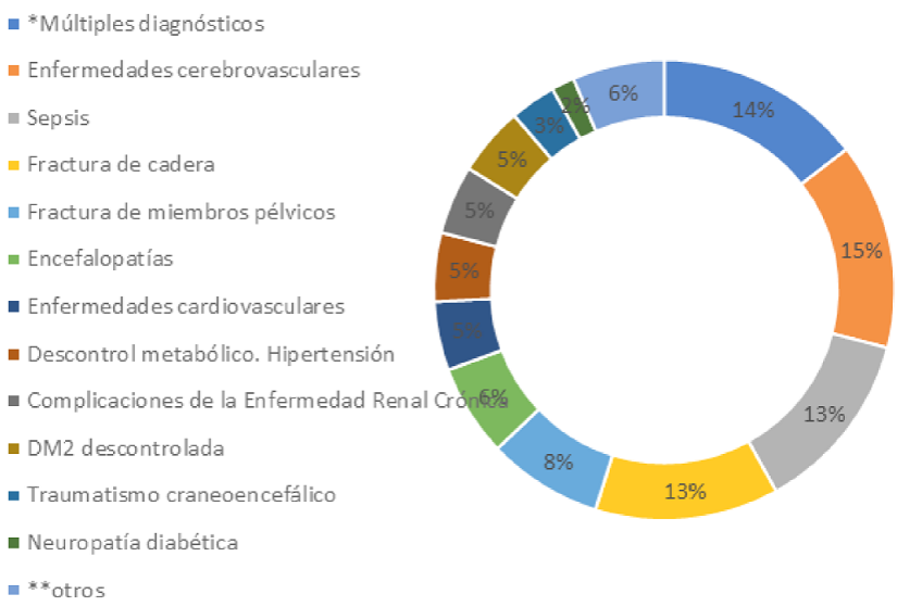 En cuanto a la etiología de la enfermedad, la mayor parte de los pacientes cursaba con alguna enfermedad no transmisible o crónico degenerativa con comorbilidades agregadas (14.5 %), enfermedades cerebrovasculares (14.5 %), insuficiencia orgánica múltiple (14.5 %), sepsis (12.9 %) y fractura de cadera (12.9 %). (Figura 1).