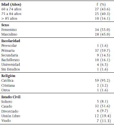 Se evaluaron 62 pacientes de los diferentes servicios descritos en los criterios de selección. El mayor porcentaje se reflejó en el rango de edad de 60 a 74 años (43.6 %), mientras que el menor porcentaje fue en adultos mayores de 85 años (16.1 %). El género femenino fue el que predominó del total de pacientes evaluados (55 %), más del 50 % cuenta con un nivel básico de estudios, primaria. En relación al estado civil, la mitad son casados, la mayoría profesan religión católica (95 %). (Tabla 1).