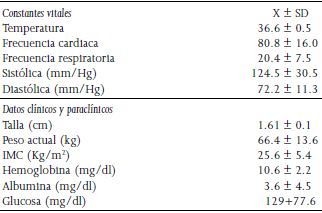 Los principales resultados clínicos y paraclínicos alterados fueron IMC (kg/m2) fue de 25.6 ± 5.4, Hemoglobina g/dl de10.6 ± 2.2. (Tabla 2).