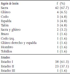 En relación con la ubicación de las úlceras, el área más afectada fue la región sacra (67.7 %), seguida de glúteos (6.5 %) y codos (4.8 %). Según la escala de Braden, el 61.3 % de las lesiones estaban en la etapa I. (Tabla 3).