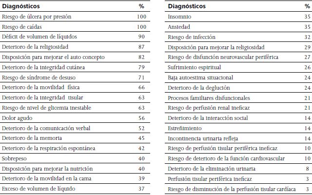 Se identificaron 36 diagnósticos de enfermería, 23 se centraron en el problema (63.9 %), 10 diagnósticos de riesgo (27.8 %) y tres diagnósticos de promoción de la salud (8.3 %). El riesgo de úlcera por presión y el riesgo de caídas se identificaron en el total de los pacientes estudiados (Tabla 4).