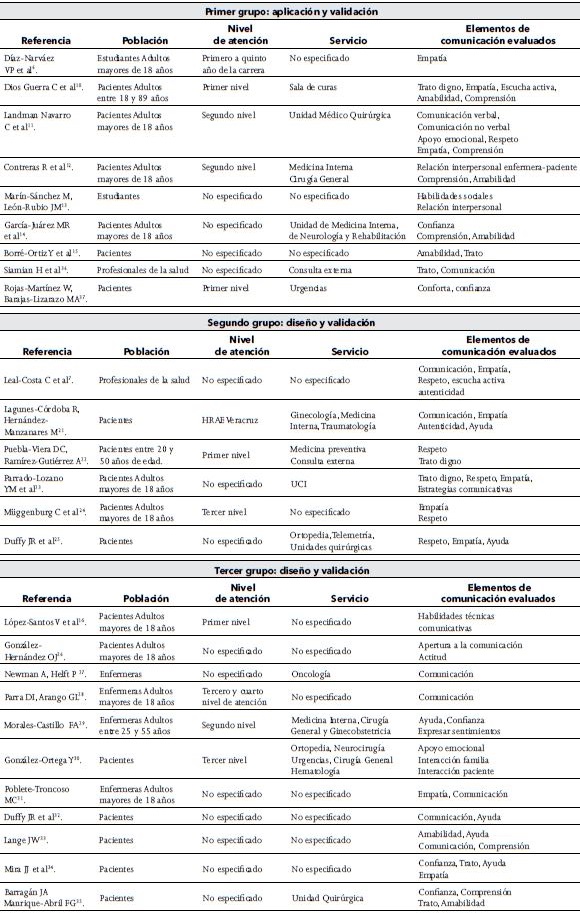 Los aspectos regularmente incluidos en los instrumentos, relacionados con una comunicación efectiva, son la empatía, las habilidades sociales y el apoyo emocional. Algunos autores además de evaluar la relación que existe entre el personal de enfermería y el paciente, investigan la calidad de la atención que se brinda en las instituciones hospitalarias14,37.