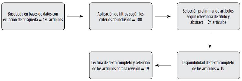 Las bases de datos seleccionadas fueron: Scopus, BVS, Scielo, Science Direct, Medline y Web of science, se hizo uso del servicio de conmutación bibliográfica para la obtención de los textos completos de los artículos.