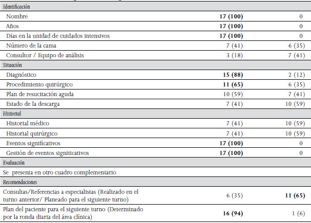 Igualmente, este artículo propone agregar otros ítems no relacionados con el ISBAR, que los participantes consideraron importante incluir en una entrega de turno, como: (estado de infección, sitio de la infección) actualizaciones adicionales del paciente (plan de fin de vida); consideraron no necesario para discutir en la entrega, las tareas administrativas, problemas de equipo y menús. Los ítems dentro de la categoría de actualizaciones de pacientes adicionales (comportamiento del paciente, investigaciones programadas) se consideraron importantes para incluir en el traspaso sólo si es relevante para el paciente16.