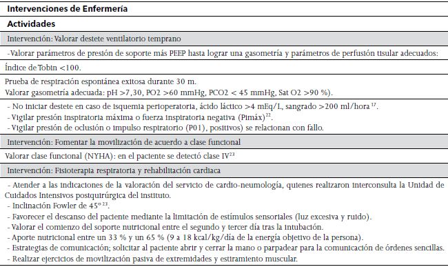 El presente Estudio de caso se realizó en la Unidad de Cuidados Intensivos (UCI) de un Instituto Nacional de Tercer Nivel de la Ciudad de México, del mes octubre a noviembre del 2017. Se formalizó la valoración inicial con una Guía que se fundamenta en las 14 necesidades de Virginia Henderson, elaborada por Coordinadores y tutores del Posgrado de Enfermería del Adulto en Estado Crítico, posteriormente se realizaron cinco valoraciones focalizadas bajo la misma guía. Se realizó el seguimiento del caso desde el servicio de Cardioneumología hasta su traslado al piso de hospitalización, como resultado se realizaron los planes de atención de enfermería con diagnósticos formulados en formato PES (Problema, Etiología y, Signos y Síntomas), con objetivos, intervenciones, actividades y sus respectivas fundamentaciones, una vez realizados se jerarquizaron de acuerdo a las necesidades más alteradas, estas se contrastaron con los criterios de ingreso a la UCI de la NOM-025-SSA3-20138 para la organización y funcionamiento de las unidades de cuidados intensivos: 5.5.1.1.2. Pacientes que presenten alto riesgo: estabilidad en peligro de sistemas fisiológicos mayores con requerimiento de monitoreo; 5.5.1.1.3. Pacientes con la necesidad de cuidados especiales o especializados, que solamente pueden ser brindados en la (UCI). En la ejecución se presentan las actividades realizadas de manera directa y observacional, de acuerdo al día de la valoración, y en la última etapa se evalúan las respuestas humanas de la persona.