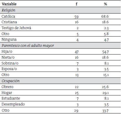 Los cuidadores que participaron en el estudio tenían una edad promedio de 39.97 (DE=13.12) años, con una escolaridad de 9.86 (DE=3.65) años. El 73.3% (f=63) mujeres, el 69.8% (f=60) con pareja marital, el 68.6% (f=59) de religión católica, el 34.9% (f= 30) refirió ser hija/o del adulto mayor al que cuida y el 29.1% (f=25) realiza actividades del hogar además de cuidar al adulto mayor (Tabla 1). Los cuidadores indicaron que en promedio dedican 14 (DE=7.57) horas al cuidado del adulto mayor.