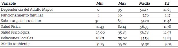 Methodology: This is a descriptive and correlational study with a snowball-derived sample of 86 caregivers in a communitarian center. The corresponding measures were estimated using the Barthel Index, the Family APGAR Test, the Zarit Test, and the WHOQOL-BREF Quality of Life Scale. The Kolmogorov-Smirnov and Spearman Correlation tests were calculated.