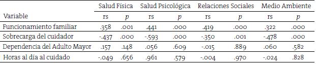 Con la Prueba de Correlación de Spearman se observó que, a mayor funcionamiento familiar, mayor calidad de vida en las dimensiones de salud física (p= .001), salud psicológica (p= .000), relaciones sociales (p= .000) y medio ambiente (p= .000). A mayor sobrecarga, menor calidad de vida en las dimensiones de salud física (p= .000), salud psicológica (p= .000), relaciones sociales (p= .000) y medio ambiente (p= .000). Adicionalmente, se hizo un análisis en busca de la relación entre la dependencia funcional del adulto mayor y el tiempo en horas que el cuidador dedica al cuidado con la calidad de vida, sin embargo; no se encontró relación estadísticamente significativa entre estas variables (Tabla 3).