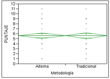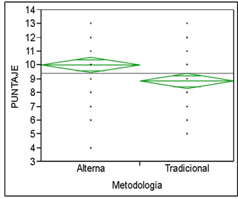En la gráfica 4 se aprecia la diferencia de medias en el postest entre ambas metodologías, en donde se observa que quienes recibieron el tema con la metodología basada en simulación clínica obtuvieron mejores puntajes; esta diferencia fue estadísticamente significativa (p=0.004).