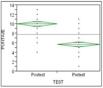 El postest se aplicó tres semanas después de realizar la simulación; la gráfica 2 nos muestra la diferencia de medias entre el pretest y el postest de quienes recibieron el tema con la metodología tradicional; se observa una diferencia estadísticamente significativa (p <.001) entre los puntajes obtenidos en ambas evaluaciones.