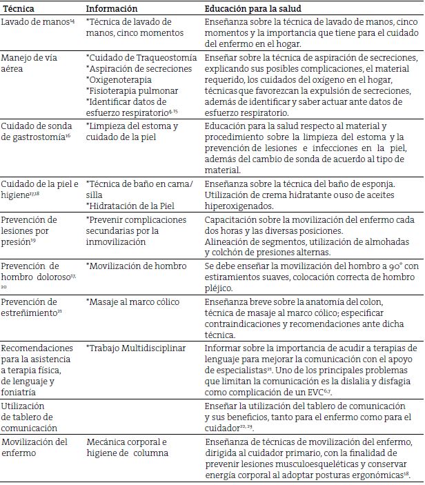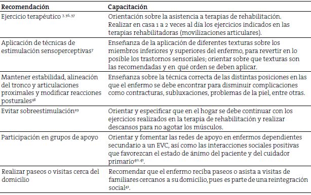Información. El cuidador primario, el enfermo y la familia deben recibir una capacitación suficiente, sobre cómo proporcionar los cuidados específicos y personalizados una vez que el paciente sea dado de alta y se encuentre en su domicilio (Tabla 3).