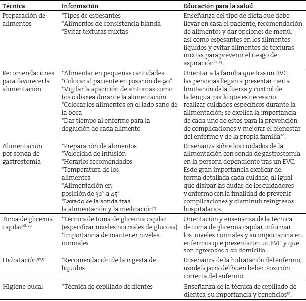 En este caso se desarrolla el plan para una persona dependiente como consecuencia de un EVC, se utiliza la nemotecnia CUIDARME, ya que emplea puntos clave para la adecuación y organización de la información que se debe enseñar al enfermo y cuidador primario, y en consecuencia, resulta una efectiva estrategia para no pasar por alto ningún elemento básico para el cuidado de la persona. Pinzón3 (autor de la nemotecnia), enfatiza que al llevar a cabo el plan de egreso a través de esta herramienta reforzará y ampliará el conocimiento de los cuidadores, lo que favorecerá la seguridad del enfermo y su calidad de vida.