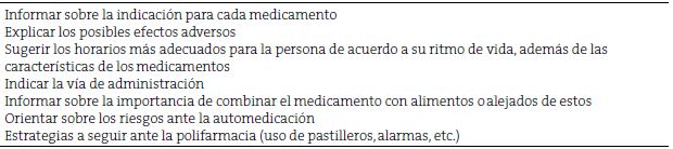 Medicamentos y tratamientos farmacológicos. Para este apartado, la información debe ser clara y suficientemente explícita, donde engloben todos los cuidados que deben efectuarse para cada medicamento, así como las sugerencias para que el tratamiento sea más efectivo. Las principales recomendaciones se encuentran en la Tabla 7.