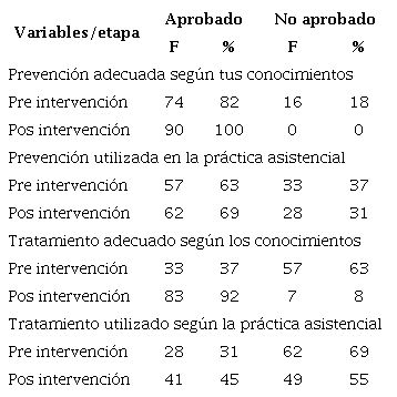 Los conocimientos de prevención fueron mejor asimilados que los de tratamiento, ya que los profesionales de enfermería poseen un dominio sobre promoción de la salud y protección específica. La intervención demostró que los participantes pasaron de 69% a 80%; con relación a esta variable, Gunninber reportó 59.3%20.