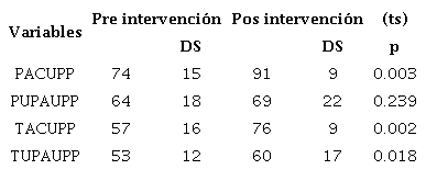 Con relación a la comparación de mediciones del grupo de intervención, como ya se observaba los porcentajes en la tabla previa, todos los promedios fueron superiores en la pos intervención en los cuatro rubros evaluados. Si bien el rango del incremento fue mayor en las variables de conocimiento que en las de utilización en la práctica asistencial (17 a 19 puntos en las de conocimiento, 5 a 7 puntos en las de utilización); en tres de estos la diferencia entre el promedio de la pre y la pos intervención alcanzó significancia estadística, evaluada con la t de student (Tabla 2).