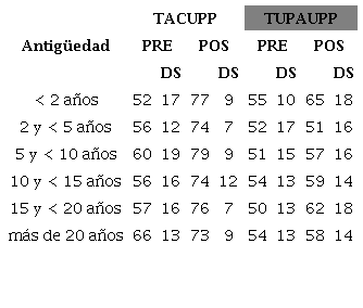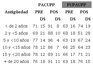 En las variables de tratamiento, la relación entre la pre y pos intervención según la antigüedad permitió observar que los incrementos entre estas evaluaciones también fueron siempre mayores en las variables relativas a conocimientos que en las de utilización en la práctica, el rango de incremento en las primeras fue de 17 a 25 puntos, en cambio en la segunda de 1 a 12 puntos. En el indicador Tratamiento adecuado según tus conocimientos (TACUPP), el mayor incremento se observó en personal con antigüedad menor a dos años laborales, donde el promedio pre intervención fue de 52±17 y pos intervención 77±9; mientras que en el indicador Tratamiento utilizado en la práctica asistencial (TUPAUPP), el mayor incremento correspondió al personal con antigüedad entre 15 y <20 años, que obtuvo un promedio pre intervención de 50±13 y pos intervención 62±18 (Tabla 3).