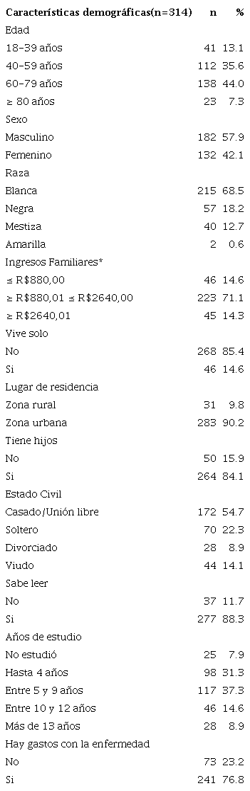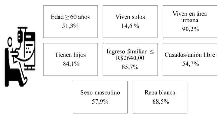 Resultados: As 314 pessoas em terapia hemodialítica têm idade ≥ 60 anos, são homens brancos com nível de escolaridade e renda baixos, moram com a família e têm filhos. Moram em zona urbana, são casados, no momento do diagnóstico e tempo em tratamento ≤ 5 anos transcorridos, referem despesas médico-hospitalares, não foram transplantados, foram hospitalizados pelo menos em una ocasião, têm comorbidades e não estão em lista de espera para transplante renal.