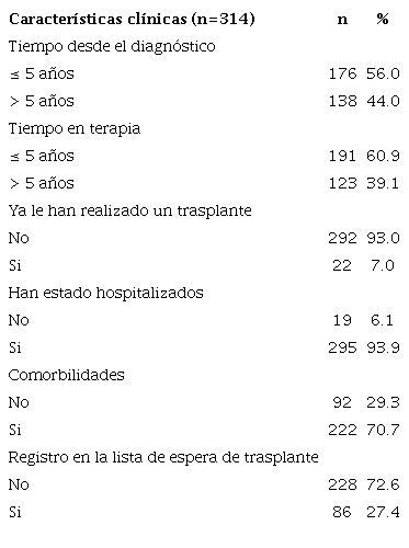 Las variables demográficas y clínicas comprenden: edad, sexo, lugar de residencia, raza, estado civil, número de hijos, nivel educativo, ingresos familiares, tiempo desde el diagnóstico, tiempo en terapia, gastos por la enfermedad, tratamiento por trasplante, registro en lista de espera, multimorbilidad y hospitalización.