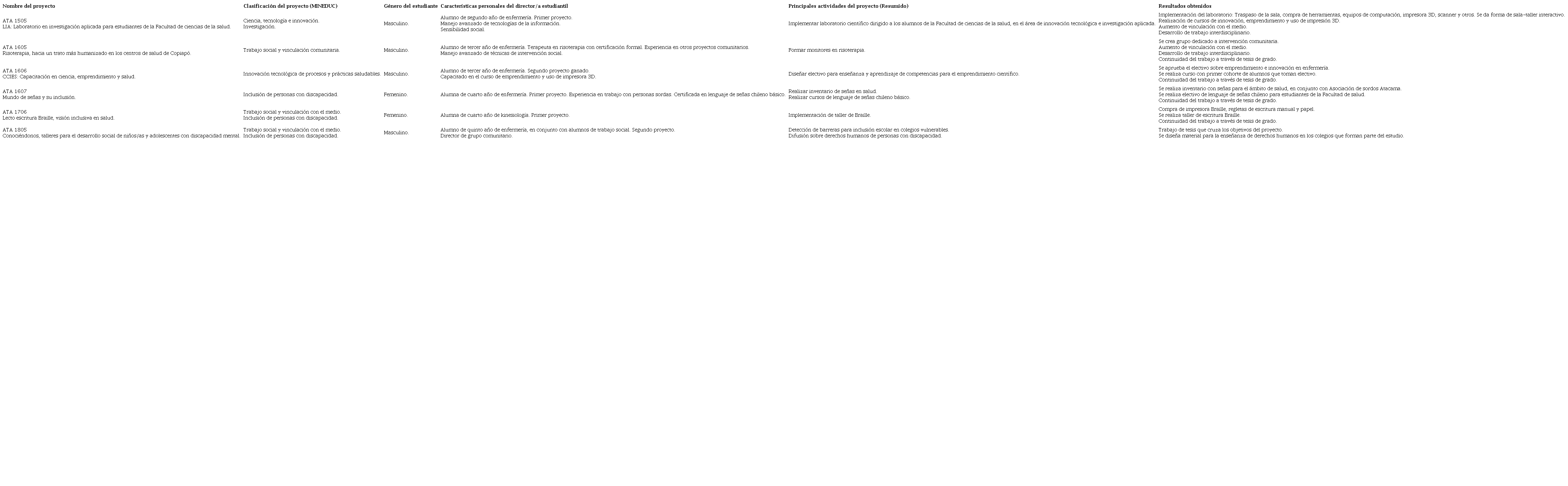El género de los directores de proyecto muestra una mayor tendencia hacia lo masculino, ya que sólo dos de seis proyectos fueron dirigidos por mujeres. Los directores estudiantiles pertenecían a distintas cohortes de estudiantes de enfermería y otras carreras de la salud. Tres de los directores estudiantiles tenían experiencia previa con proyectos, quienes además lideraron la formación de monitores en sus áreas de conocimiento; uso de tecnologías 3D, risoterapia y lengua de señas chilena.