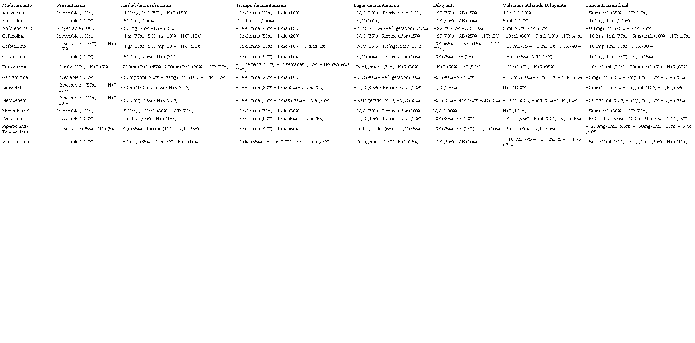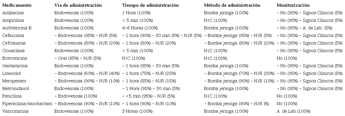Resultados: Recopilou-se informação de 14 antimicrobianos, dos quais a apresentação do 92.8% deles era injetável e o 78.2% dos inquiridos reconhecia o valor da unidade de dosagem do medicamento. Manutenção 85.7% dos antimicrobianos são eliminados depois de sua preparação. Para diluição utiliza-se maiormente a solução fisiológica em um 76.9% dos casos e o volume utilizado de diluente e concentração final variou segundo cada medicamento. Um 92.8% dos antimicrobianos administra-se por via endovenosa e todos através de uma bomba de seringa. Monitoramento específica da administração só se realiza em um 7.2% deles.