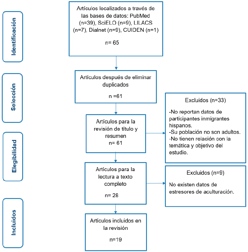 Fase 1. La primera fase consistió en elaborar la pregunta de investigación, la cual se diseñó utilizando el formato de Concepto, Población y Contexto (CPC)18, considerando C: estresores de aculturación, P: inmigrantes hispanos adultos y C: Estados Unidos de América. Con base en lo anterior, la pregunta de investigación fue: ¿cuáles son los estresores de aculturación que presentan los inmigrantes hispanos en Estados Unidos de América? A partir de la pregunta de investigación se establecieron los criterios de inclusión: artículos científicos en texto completo publicados entre los años 2016 y 2020 en inglés, español y portugués que abordaban estresores de aculturación del inmigrante hispano en los Estados Unidos de América. Se excluyeron estudios piloto y literatura gris.