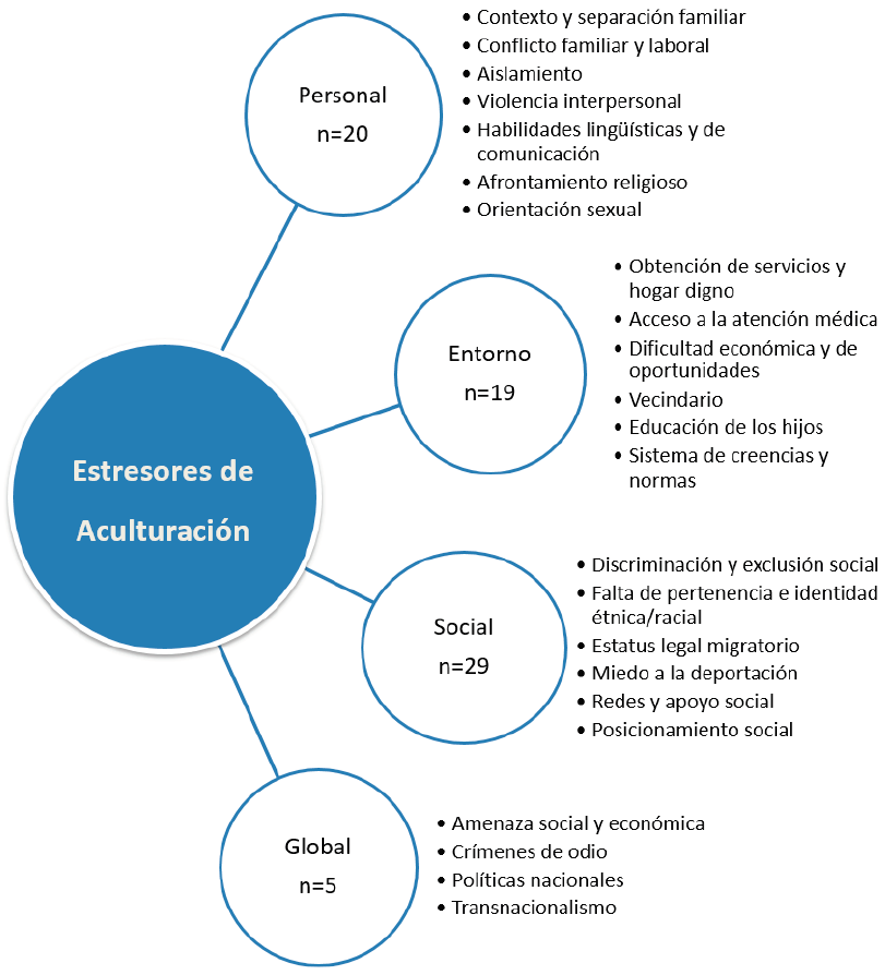 De acuerdo con el análisis, se categorizaron los estresores de aculturación en cuatro categorías, las cuales se muestran en la figura 2 y se describen a continuación: