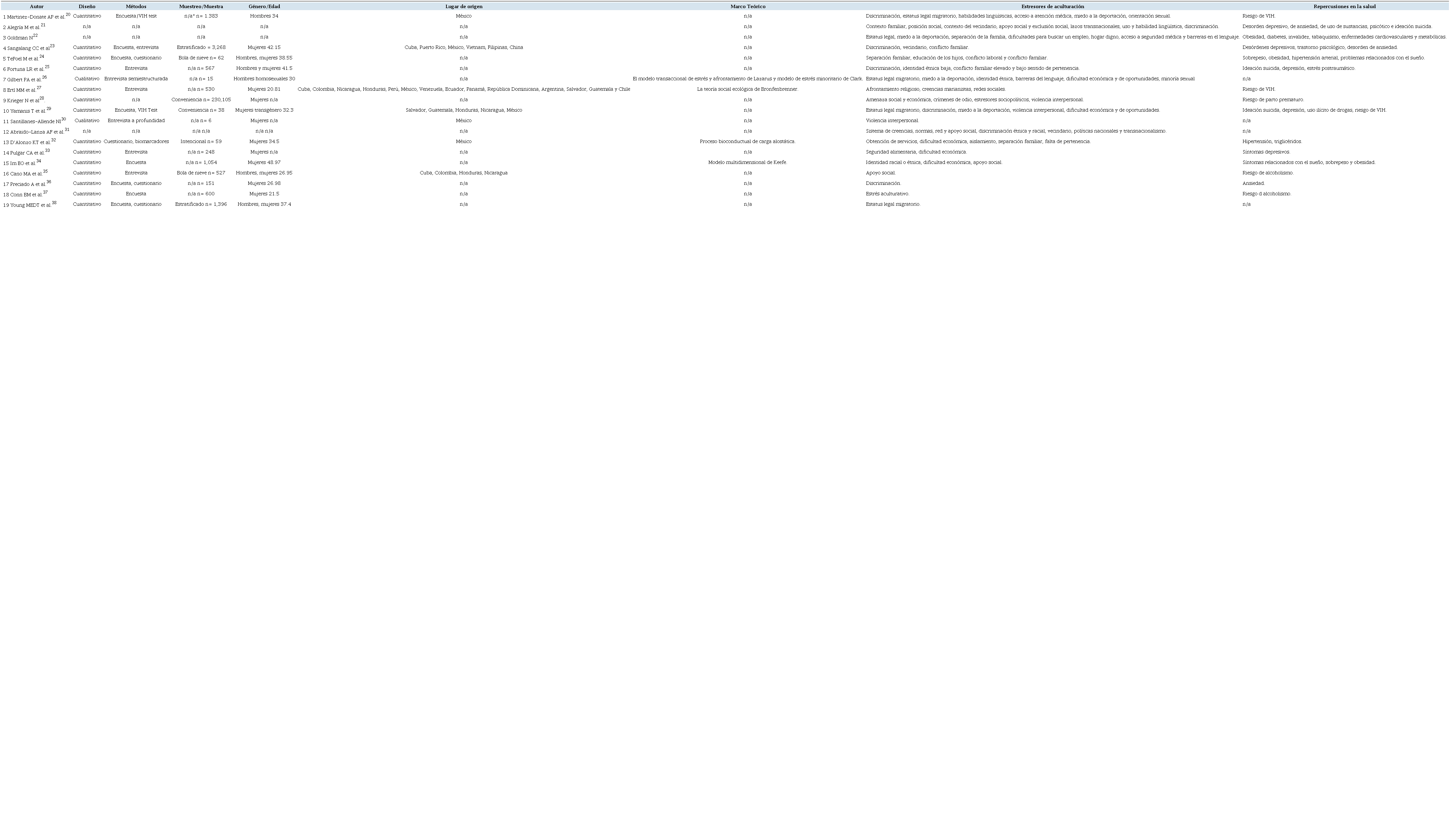 Como se puede observar en la tabla 2, dentro de los 16 estudios empíricos existen 13 que reportan la edad promedio de los participantes con una media de 33.5 años. Respecto al género de las muestras analizadas, la mayoría corresponde a mujeres (n=9), hombres y mujeres (n=4), hombres (n=1), mujeres transgénero (n=1) y homosexuales masculinos (n=1). Respecto al lugar de origen de los inmigrantes hispanos, la mayoría provienen de: México (n=6), Centroamérica (n=3), Caribe (n=3) y Sudamérica (n=2). El uso de un marco teórico se informó en cuatro estudios, los cuales reflejan el uso del proceso bioconductual de carga alostática, la teoría social ecológica, entre otros.