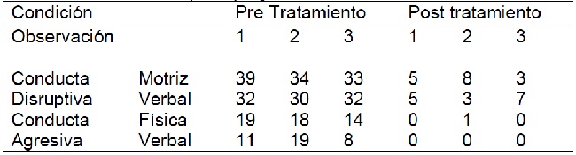La evaluación pre y post tratamiento de la ocurrencia de la conducta disruptiva y de acoso escolar, permitió identificar que antes del tratamiento, la conducta que más se presentó fue la conducta disruptiva motriz (permanecer fuera de su lugar, caminar por el aula, subirse a la mesa, comer, aventar objetos, salirse del aula sin permiso) con un total de 106 veces, seguida por la conducta disruptiva verbal (silbar, reír, gritar, conversar con otros, jugar con otros, eructar) con 94 veces. Después del tratamiento la conducta disruptiva motriz disminuyó notablemente de 106 eventos a 16 episodios y la conducta disruptiva verbal de 94 a 15 episodios. Con respecto a la conducta agresiva física (empujar, arrebatar, pegar, romper objetos), antes del tratamiento se presentó con mayor frecuencia en el aula escolar con 51 episodios y la verbal (insultar, llamar apodos, amenazar) con 38 episodios. Después del tratamiento no hubo registros del comportamiento agresivo verbal y se registró un solo episodio de agresión física. En la Tabla 1 se muestra la frecuencia de conducta disruptiva y agresiva en las ocho aulas focales durante tres periodos de observación antes y después del tratamiento.