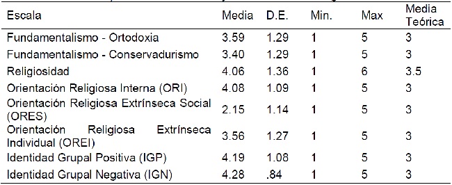 Los análisis se obtuvieron por medio de análisis descriptivos, de predicción y de correlación. En la tabla 1 se puede observar los valores promedio, dispersión, valores máximos y mínimos y el puntaje promedio teórico. Se observa que el promedio de las escalas, con excepción de la Orientación Extrínseca Social (ORES), superan la media teórica, lo que nos indica que las variables de nuestro estudio se presentan de manera consistente entre nuestros participantes.