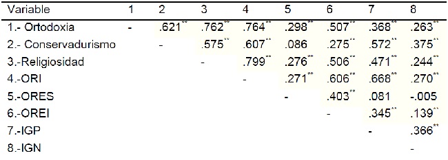 Se observó que las correlaciones más altas se presentan con dos variables, la religiosidad o conducta religiosa, la cual se relaciona de manera fuertemente significativa con la ortodoxia (r=.76, p<.01), y con la ORI (r=.79, p<.01). Por su parte la ORI a su vez presenta correlaciones de moderas a altas con ortodoxia (r=.76, p<.01), conservadurismo (r=.60, p<.01), OREI (r=.60, p<.01) y IGP (r=.66, p<.01). Al contrario de lo ocurrido con otro de los componentes de la orientación religiosa, la ORES, la cual solo presenta una relación moderada con el otro componente de la orientación religiosa extrínseca la OREI (r=.40, p<.01) (Ver Tabla 2).