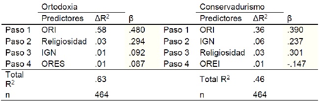 Por su parte, los predictores del conservadurismo resultaron ser muy similares a los de la ortodoxia, con el único cambió de que es la orientación intrínseca individual y no la social, la que añade valor predictivo a nuestro modelo, relacionándose de manera negativa con el conservadurismo, aunque de igual manera, esta contribución es pequeña.