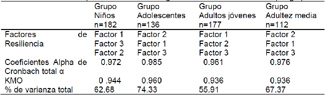 Con el objetivo de conocer la estructura factorial de la variable resiliencia en cada grupo de edad, se realizaron análisis factoriales exploratorios con el método de componentes principales y rotación ortogonal de tipo varimax, considerando un peso factorial mayor a .40, así como la confiabilidad para cada uno. En todos los casos se cumplió el criterio de adecuación muestral (p=.000) que indican Hair, Anderson, Tatham y Black (2004) en que se considera que el modelo factorial es adecuado para explicar los datos. La composición factorial fue de tres dimensiones con pesos factoriales que oscilan entre .42 a .79 y un porcentaje de varianza satisfactorio. En la Tabla 1, se observan que se presentan en distinto orden los factores. En el caso del factor 1 (factores protectores internos) se presentó en primer lugar en el grupo de niños y de adultos jóvenes, mientras que en el caso de los grupos de adolescentes y de adultez media la mejor solución factorial hallada fue el factor 2 que corresponde a factores protectores externos. Mientras que el factor 3 de empatia se conservó en el tercer lugar en todos los grupos excepto en el grupo de niños. Asimismo, se obtuvo una consistencia interna para cada tramo de edad, con los 32 reactivos a través de Alpha de Cronbach la cual resultó superior a 0.90 en los cuatro grupos (ver Tabla 1).