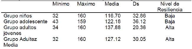 Posteriormente, se llevó a cabo un análisis descriptivo con el objetivo de comprobar las puntuaciones y obtener niveles de resiliencia lo cual se hizo a partir del puntaje total bruto obtenido de la escala de resiliencia a partir de la suma de los 32 reactivos y se establecieron puntos de corte a partir de la media ±1 desviación estándar. Con base en estos criterios, se obtuvieron los siguientes niveles: de 32 a 95 puntos muy baja resiliencia, 96 a 126 baja, 127 a 157 alta y de 158 a 160 muy alta resiliencia. En la Tabla 2 se muestran los datos descriptivos para cada grupo de edad, que indican resiliencia baja en el caso de los niños y adolescentes, mientras que los adultos jóvenes y adultez media se encuentra en el nivel de resiliencia alta (ver Tabla 2).