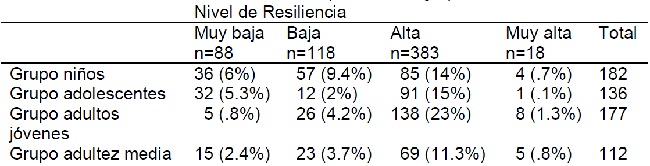 Asimismo, en las frecuencias absolutas se observa que la muestra presenta en mayor proporción un nivel alto de resiliencia, seguido de resiliencia baja y muy baja, específicamente un 23% del total de la muestra se encuentra en el nivel de resiliencia alta que es el grupo de adultos jóvenes (ver Tabla 3).