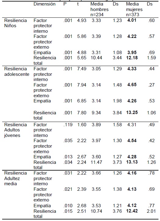 Con el objetivo de observar diferencias respecto a la variable sexo, se utilizó una prueba t de Student, en la que se encontraron diferencias estadísticamente significativas a favor de las mujeres en los cuatro grupos de edad, que indican mayores factores protectores internos, externos, empatia y resiliencia total en comparación con los hombres, con excepción del factor protector interno en adultos jóvenes que resultó no significativo (ver Tabla 4).