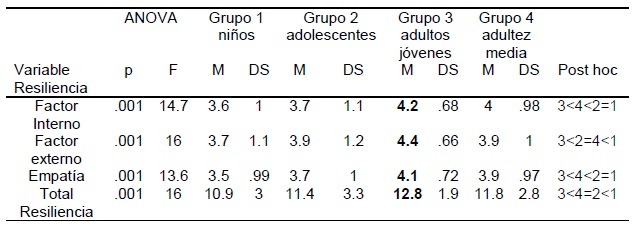 Se llevó a cabo un análisis para conocer si los cuatro grupos de edad difieren significativamente en las dimensiones y en el total de resiliencia, para lo cual se llevó a cabo un análisis de varianza y un análisis posthoc, que indican que el grupo de adultos jóvenes es estadísticamente distinto a los otros tres grupos, ya que presentan las medias más altas en el factor protector interno, externo, empatia y resiliencia total y hay un pequeño descenso de las puntuaciones en las dimensiones en el grupo 4 (ver Tabla 5).