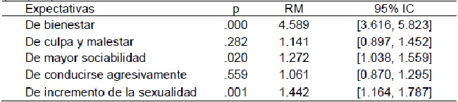 En jóvenes, las expectativas positivas asociadas al consumo de alcohol comprenden la facilitación de la interacción y de la expresión verbal, la desinhibición de la conducta, el incremento de la respuesta sexual y la reducción de la tensión psicológica (Camacho, 2005; Ferrer, 2009; Londoño, García, Valencia & Vinaccia, 2005; Mora & Natera, 2001; Mora, Natera & Juárez, 2005), amén de incremento de la agresividad y el poder, así como de reducción de la tensión física, en el caso de los hombres (Londoño et al., 2005). En los varones, las expectativas de aumento de la agresividad y de poder contribuyen a que se involucren con mayor frecuencia en conflictos y riñas (Mora & Natera, 2001; Quigley, Corbet & Tedeschi, 2002).