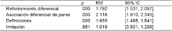 En cuanto a la TAS, la regresión arroja una varianza explicada de 27.1%, clasificando correctamente a 73.3% de la muestra y al 56.1% de los casos de UNDA. En este caso, los jóvenes con más amigos que beben alcohol con frecuencia (asociación diferencial de pares) tienen un riesgo 111% mayor de UNDA que los jóvenes que no reportan tal condición. Las variables de reforzamiento diferencial y definiciones presentaron también pesos predictivos estadísticamente significativos (ver Tabla 2).