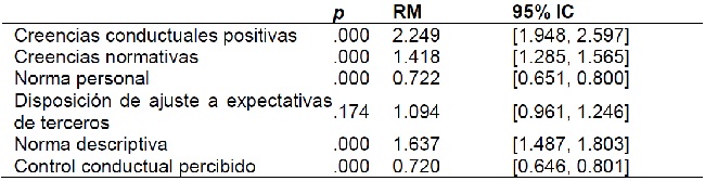 En un último análisis (Tabla 4, Análisis 6), hecho con base en los Análisis 3 y 5, se reintegraron las variables de la TCP excepto creencias conductuales positivas. Como resultaba esperable, se registró un más alto peso predictivo de las expectativas de bienestar (TE), sin que ninguno otro indicador presentara modificaciones sustanciales respecto al Análisis 2 de referencia.