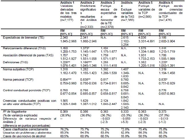 Con el fin de determinar un modelo explicativo que reuniera todos los predictores significativos de los modelos de estudio, se efectuó un análisis de regresión logística con método de Forward selection, que genera un modelo que incorpora paso a paso sólo las variables con peso significativo. Los resultados de este análisis se reportan en la Tabla 4 columna de Análisis 1, donde las variables incluidas en la ecuación como factores de riesgo fueron (de mayor a menor peso): expectativas de bienestar (TE); asociación diferencial de pares (TAS); creencias conductuales positivas (TCP); reforzamiento diferencial (TAS); norma subjetiva (TCP) y “definiciones” o aprobación del consumo entre los jóvenes (TAS). Como factores protectores resultaron significativos la norma personal o percepción de un impacto negativo del uso de alcohol (TCP) y el control conductual percibido entendido como capacidad para controlar la cantidad que se bebe (TCP).