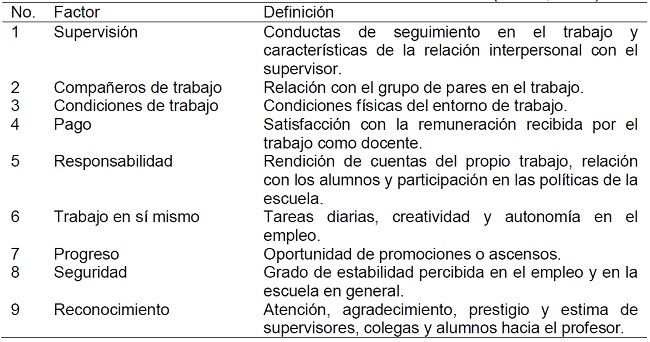 Según datos de la Cuarta Encuesta Europea sobre Condiciones de Trabajo (Eurofound, 2005), en el ámbito educativo se han encontrado las tasas más altas de estrés, ansiedad e irritabilidad (Milczarek, Schneider & Rial-González, 2009) que afectan el nivel de satisfacción laboral de los profesores; además, los resultados de las investigaciones frecuentemente parecen contradictorios y ambiguos, debido al uso de instrumentos que carecen de reactivos referentes al contenido específico de la labor docente (Davis & Wilson, 2000; Pearson & Moomaw, 2005; Quaglia & Marión, 1991; Tye & O’Brien, 2002). En este sentido, el Cuestionario de Satisfacción Laboral para Profesores (TJSQ por sus siglas en inglés), fue originalmente elaborado por Lester en 1987, con 66 reactivos en nueve factores o subescalas (ver Tabla 1): Supervisión, Compañeros de trabajo, Condiciones de trabajo, Pago, Responsabilidad, Trabajo en sí mismo, Progreso, Seguridad, Reconocimiento.